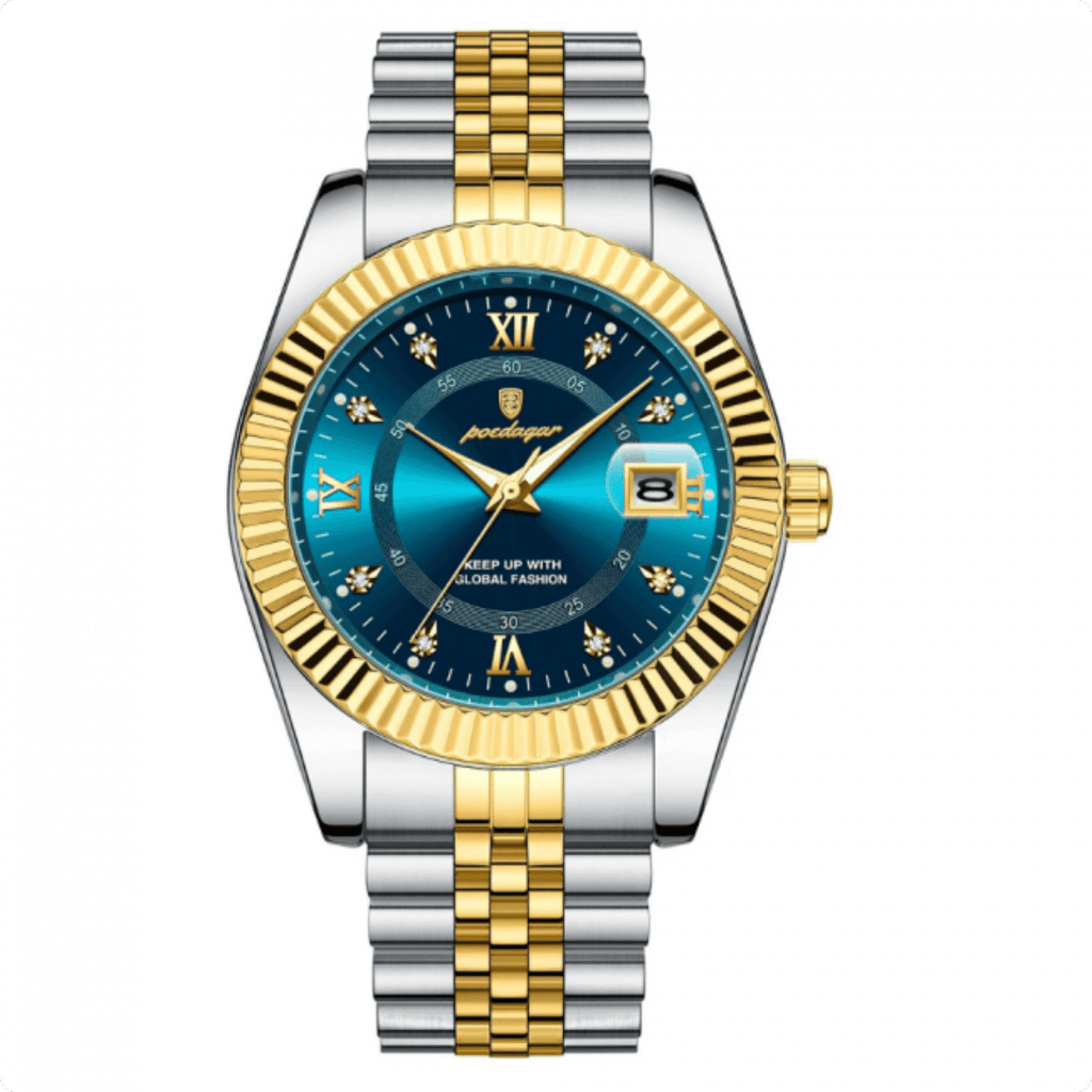 With a sophisticated and striking aesthetic, the Poedagar GoldenStar stands out with its vibrant blue dial, gold details and stainless steel bracelet. When you wear this watch, you enjoy every second with style and precision.